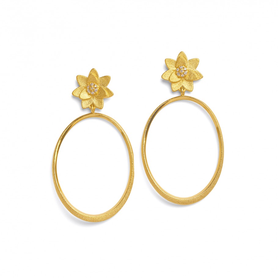 Die Ohrhänger Holma überraschen mit einem spannungsvollen Kontrast zweier unterschiedlicher Formen. Die Blüten der Designlinie Hortensia wurden hier mit einem großen, ovalen Rahmen kombiniert, der durch seine sanfte Drehung und dem Wechselspiel von matt gebürsteter Oberfläche und glänzender Schliffkante faszinierende Reflexe erzeugt. Der zarte Rahmen schwingt leicht am Ohr der Trägerin. Die lange, gleichnamige Kette ergänzt den außergewöhnlichen Ohrschmuck zu einem beeindruckenden Set. Zu den imposantesten und schönsten Blüten zählt die Hortensie, die Yvonne Wolf für ihre neue Schmuckblüte interpretiert hat. Bei den Schmuckstücken der Designlinie sind die markanten, leicht angewinkelten, stilisierten Blütenblätter um einen glitzernden Blütenstempel angeordnet. Die Hortensie ist ein Symbol für Schönheit, Hingabe und Dankbarkeit.