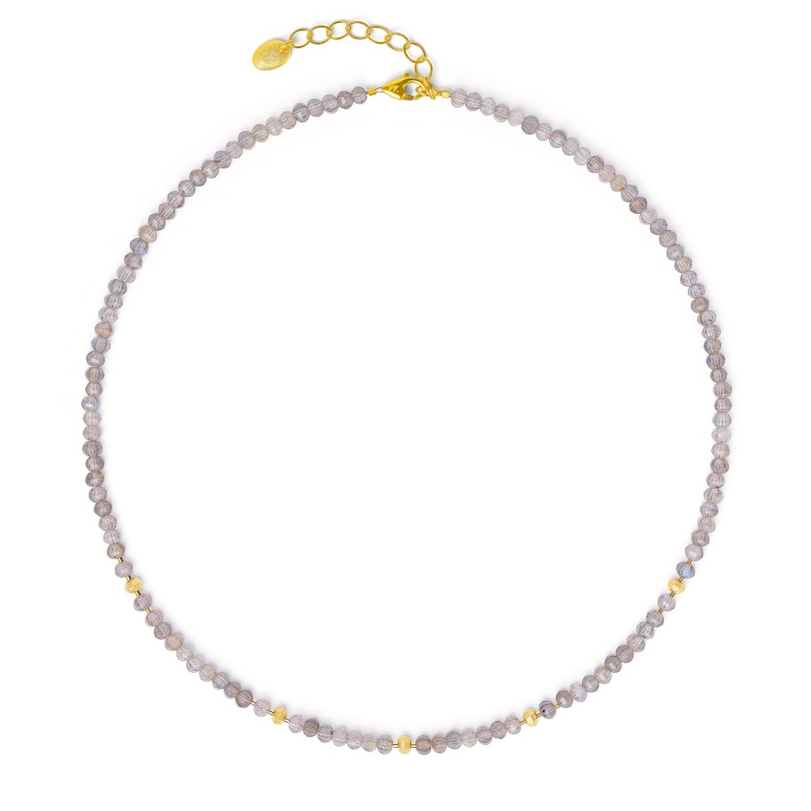 Labradorite displays a captivatingly vibrant interplay of iridescent colors that change according to the beholder’s angle of view and the angle of the incident light as a result of light reflection and absorption. This is also how this gemstone assimilates the colors of its wearer’s garments. You can find further information in the lexikon of gemstones.