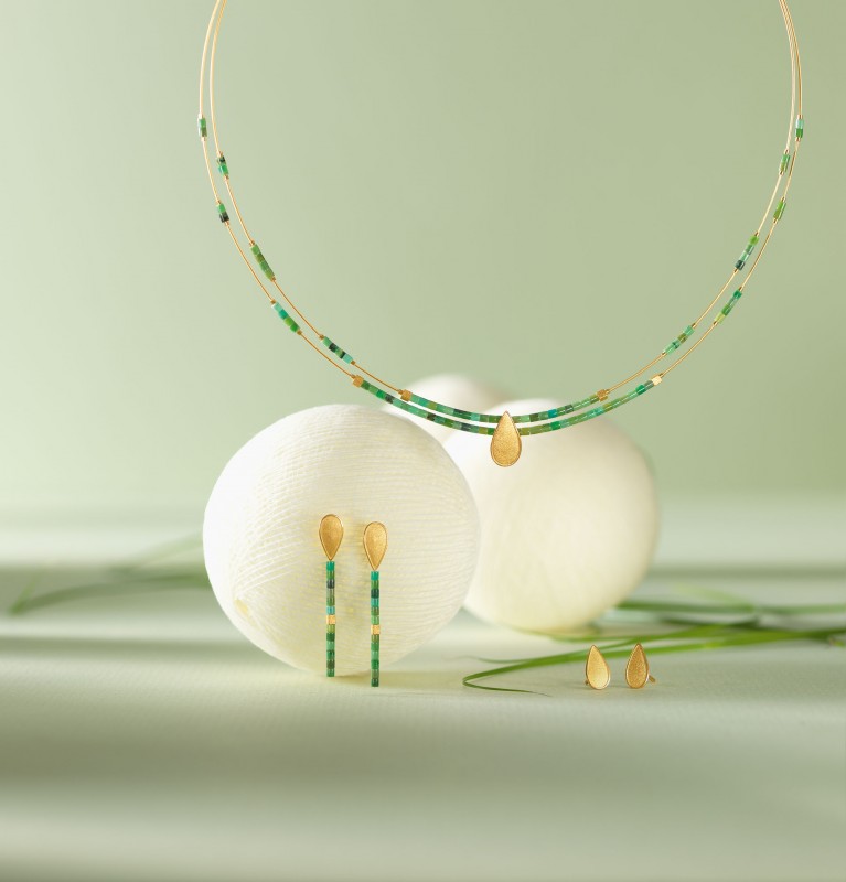 Wasser als Lebenselixier und Quell der Lebendigkeit ist das Leitmotiv der BERND WOLF Designlinie Aqua. Symbolisiert wird dies durch strahlend leuchtende Tropfen, die uns mit dem edlen Glanz in ihren Bann ziehen. Die Ohrhänger Yaquina verbinden den Tropfen der Designlinie Aqua mit einer klaren Linie aus Türkis in facettenreichem Grün. Die Steine sind auf eine feine Kette gefädelt und bewegen sich deshalb mit raffinierter Leichtigkeit.