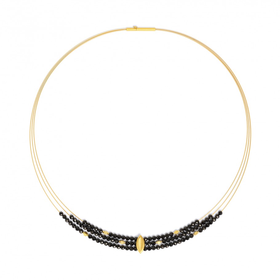 Die konkave Innenfläche des navetteförmigen Elements in der Mitte des Colliers Navensi mit seiner von Hand seidig mattierten Schliffkante erzeugt mit jeder Bewegung ein edles Spiel der Reflexe. Facettierte Kugeln aus tiefschwarzem Spinell, auf hoch flexible Feinseile gefädelt, umrahmen das zentrale Element. Die bezaubernden, schwarz funkelnden Edelsteine in wunderbarer Qualität werden durch polierte Röhrchen und matt gebürstete Würfel unterbrochen. Das Collier Navensi ist ein Schmuckstück von schlichter Eleganz - vielseitig einsetzbar und immer ein Hingucker. Die konkaven Grundelemente der neuen Designlinie Navette geben ein eindrucksvolles Spiel von Licht und Schatten. Schiffe sind Sinnbilder für das Reisen, den Aufbruch und die Veränderung und sind Symbol dafür uns zu neuen Ufern zu tragen.
