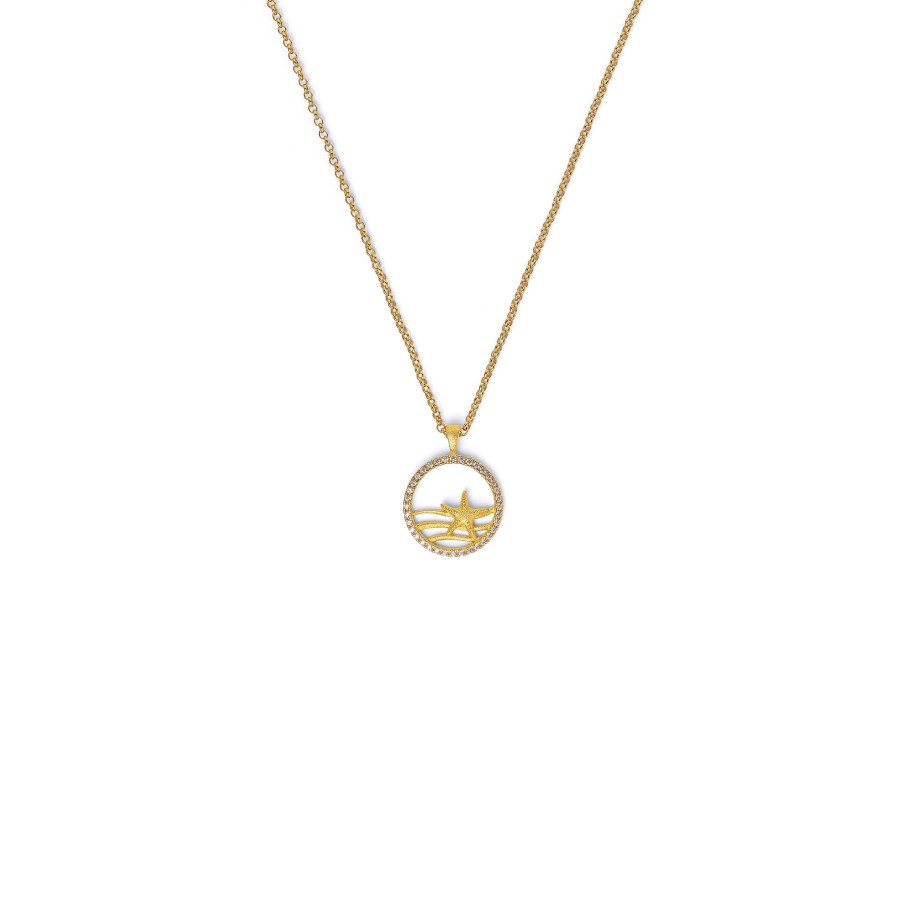 Der Seastar Anhänger hat einen maritim sportlichen Look: Innerhalb eines funkelnden Zirkoniarahmens schwebt ein Seestern vor drei wellenförmigen Goldbändern. Ein dynamisches Schmuckstück, dass die Begeisterung für das Meer ausdrückt. Mit Delfinen, Seesternen und Muscheln bezaubert die neue maritime Kollektion von BERND WOLF. Vom kleinen Anhänger mit und ohne funkelndem Zirkonia bis zum großen frei schwingenden Eyecatcher bietet die Kollektion für alle LiebhaberInnen von maritimen Erlebnissen an schönen Stränden und auf See zauberhafte Schmuckstücke.