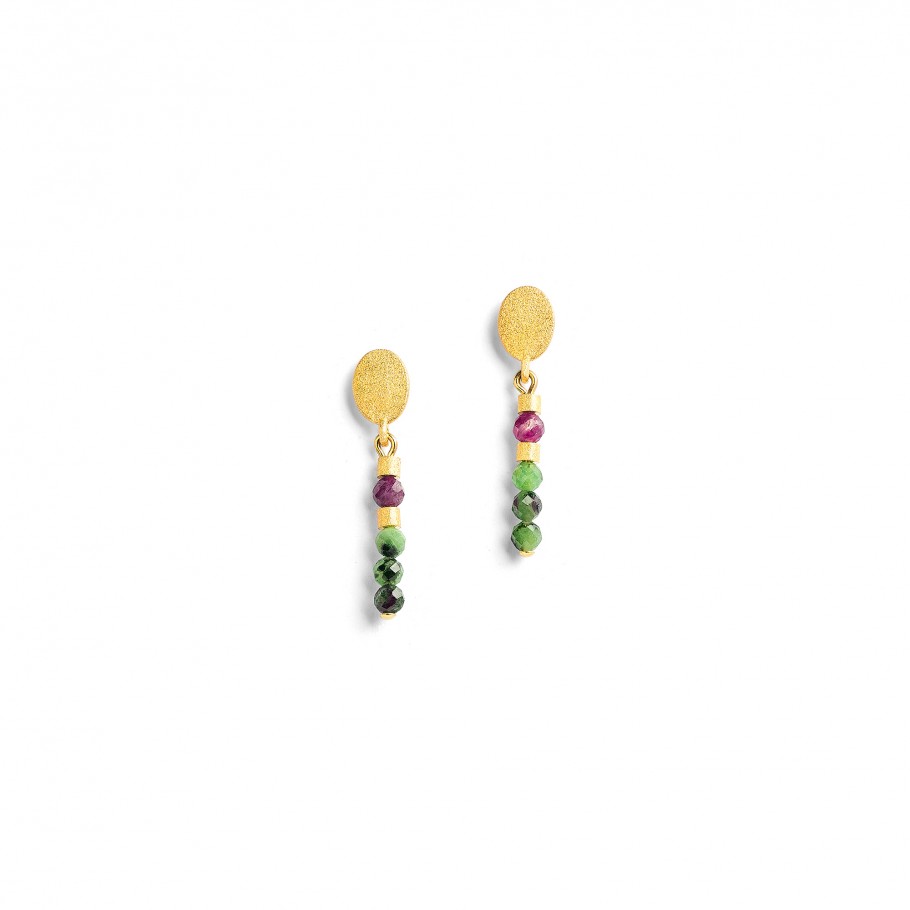 Das Farbspiel dieser außergewöhnlichen Edelsteine macht die Ohrhänger Steira zu einem wahren Hingucker. Im oberen Teil leuchten kleine Zylinder in dem warmen Goldton der 24-Karat-Premiumplattierung. Kugeln aus facettiertem Rubin-Zoisit sind auf feinen Draht gefädelt und schwingen leicht. Sie blitzen mit lebendigen Reflexen bei jeder Bewegung. Ob zum kleinen Schwarzen oder zum eleganten Abendkleid, die Schmuckstücke aus der Designlinie Cleopatra sind wahre Eyecatcher. Ihr filigranes, fließendes Design unterstreicht den femininen Look und die Persönlichkeit der Trägerin in einzigartiger, harmonischer Weise.