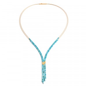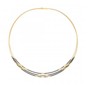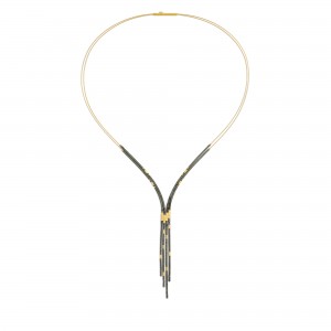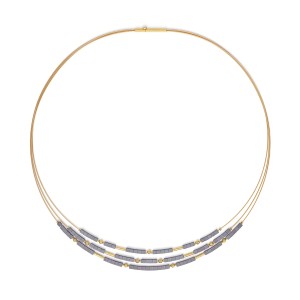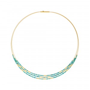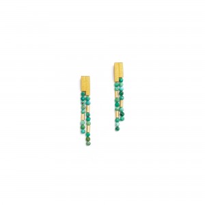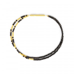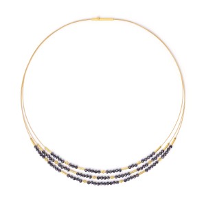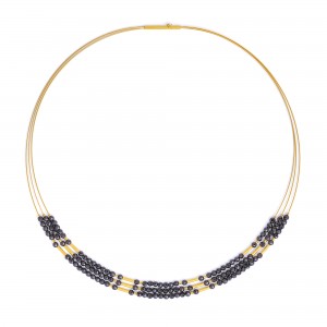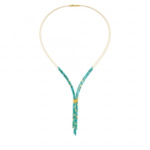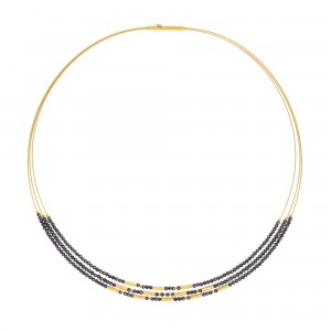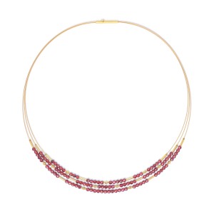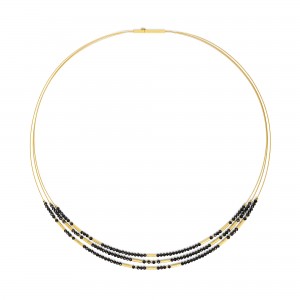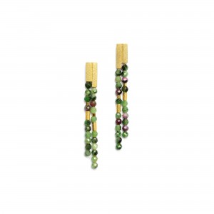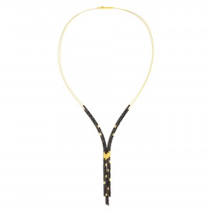 Ob zum kleinen Schwarzen oder zum eleganten Abendkleid, die Schmuckstücke aus der Designlinie Cleopatra sind wahre Eyecatcher. Ihr filigranes, fließendes Design unterstreicht den femininen Look und die Persönlichkeit der Trägerin in einzigartiger, harmonischer Weise. Die Ohrhänger Yaneki verbinden dezente Verspieltheit mit klarer Formensprache. Die facettierten Spinellkugeln sind im Wechsel mit goldplattierten Röhrchen auf eine sehr feine Kette gefädelt und schwingen deshalb mit zarter Bewegung - eine Arbeit, die höchste Präzision erfordert. Die ausgewogene Asymmetrie macht die Ohrhänger zu perfekten Begleitern der Colliers aus der Designlinie Cleopatra.